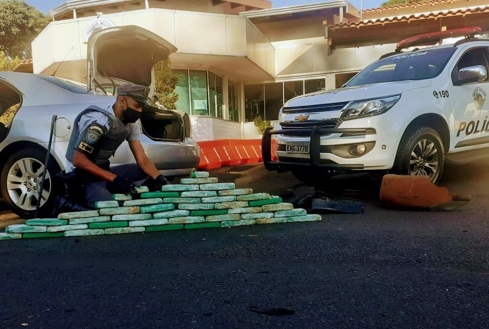 No carro, a equipe policial localizou 44 tijolos de maconha que estavam escondidos em quatro fundos falsos.