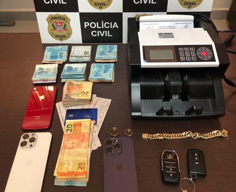 Os policiais apreenderam uma pulseira e dois anéis de ouro, três cheques totalizando R$ 93 mil, R$ 7.830 em cédulas diversas e uma caminhonete Toyota Hilux modelo 2023.