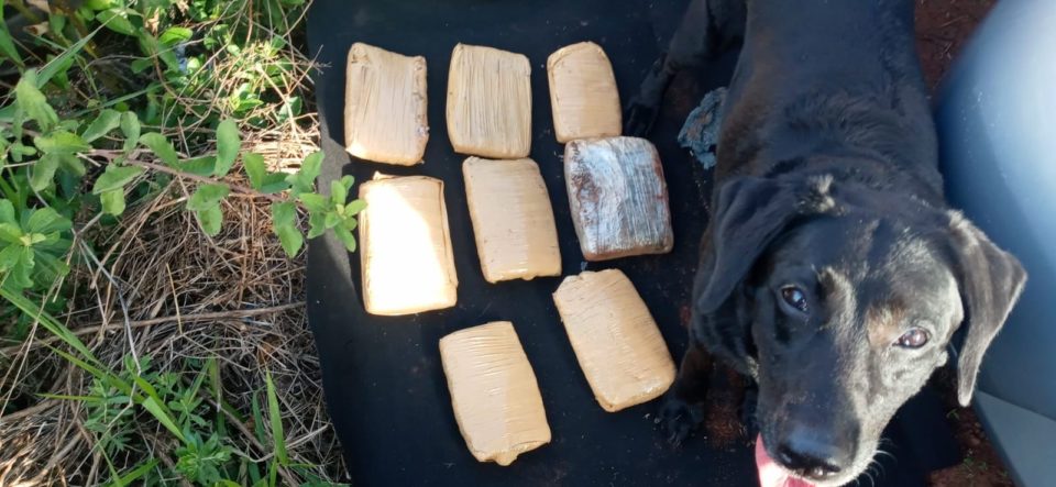 Policiais militares, em patrulhamento com cães por Marília, em apoio à PF, apreenderam oito tijolos de maconha.