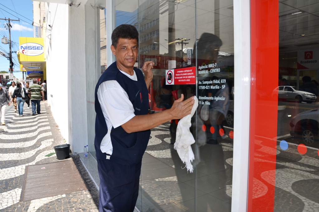 Funcionário terceirizado limpa vidro onde estavam cartazes de greve. (Foto: Leonardo Moreno)