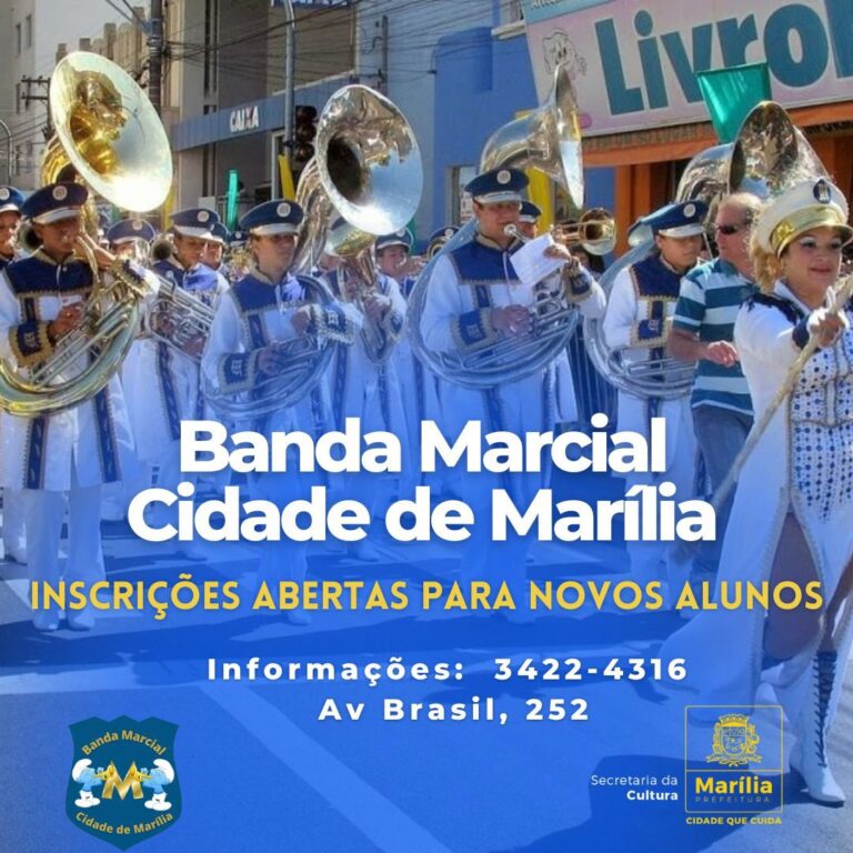 A Banda Marcial Cidade de Marília está com inscrições abertas para novos alunos. Os interessados podem se inscrever de segunda a sexta-feira, das 13h às 17h e das 18h às 21h, na avenida Brasil, 252, ou pelos telefones (14) 3422-4316 e (14) 9 9831-0899, com Marcos.