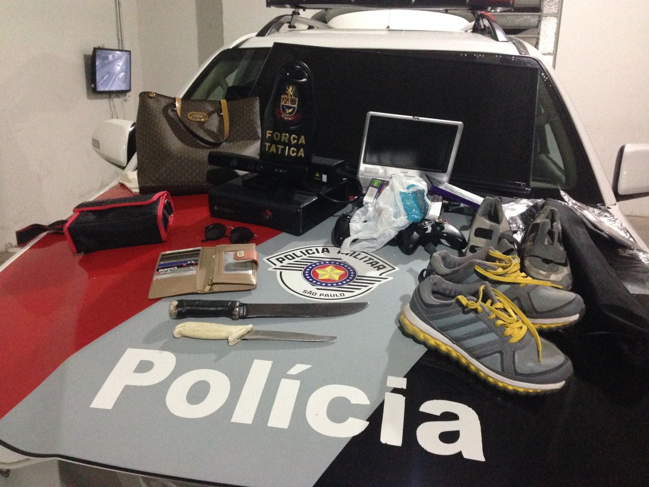 Também foram apreendidas as facas utilizadas pelo ladrões e uma peça de roupa utilizada para amarrar a fonoaudióloga.