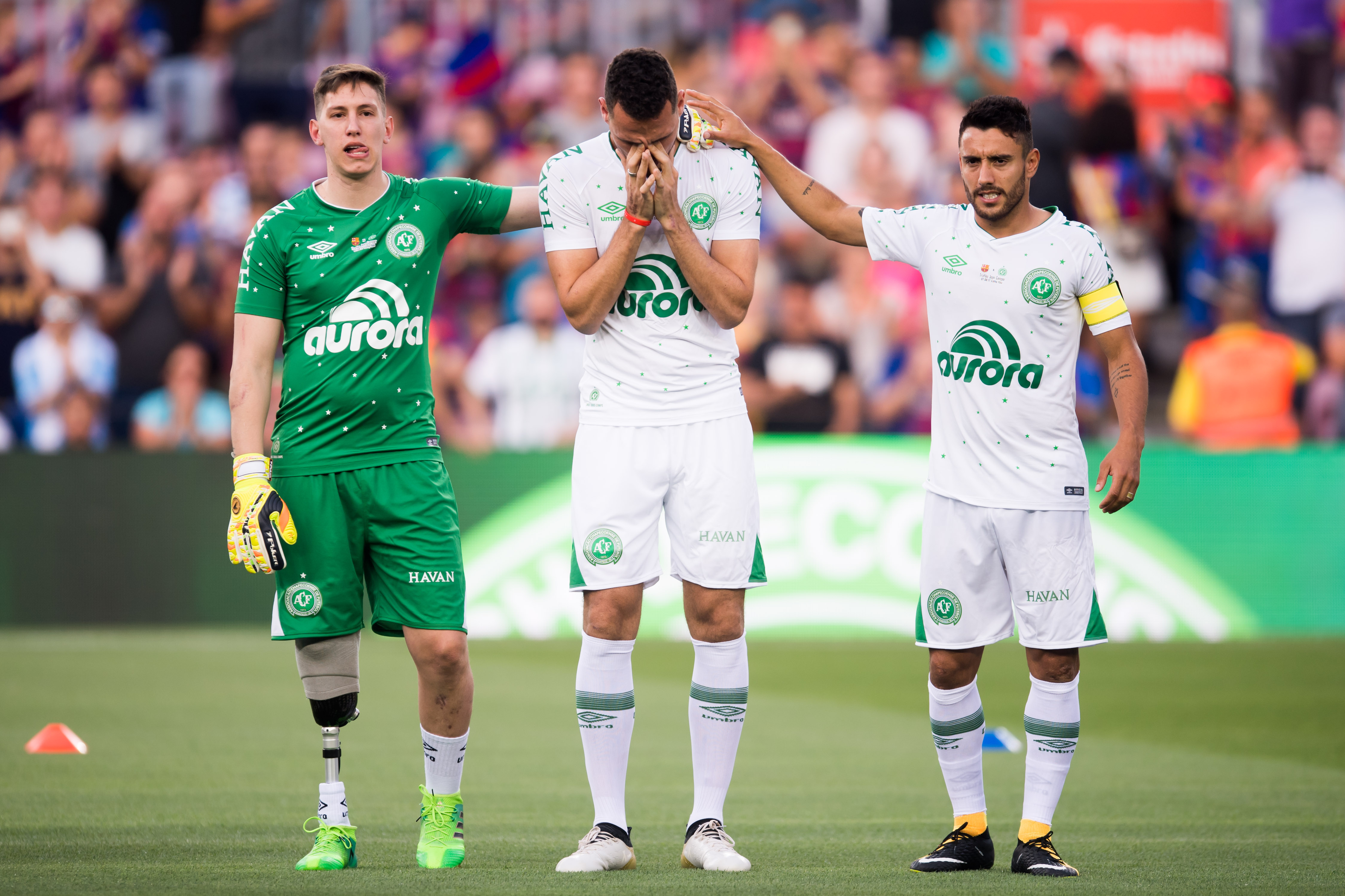 BARCELONA, SPAIN - AUGUST 07: Neto (C) of Chapecoense cries between his teammates Follmann (L) and Alan Ruschel (R) before the Joan Gamper Trophy match between FC Barcelona and Chapecoense at Camp Nou stadium on August 7, 2017 in Barcelona, Spain. (Photo by Alex Caparros/Getty Images)