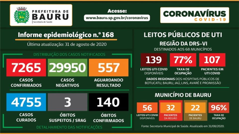 Bauru contabiliza 7.265 diagnósticos positivos, dos quais 4.755 pessoas são consideradas curadas e há 140 mortes. Três mortes estão sob investigação.