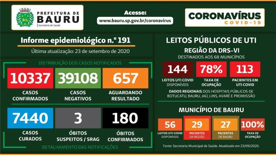 Bauru soma 10.337 casos confirmados, sendo 7.440 curados e 180 mortes. Outros 657 casos considerados suspeitos aguardam confirmação. Há três mortes sob investigação.