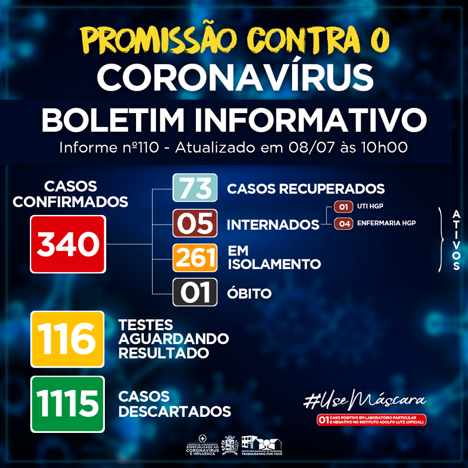 A cidade contabiliza 340 testes positivos da doença, sendo 73 considerados recuperados e um óbito. Outros 116 casos suspeitos estão em investigação.