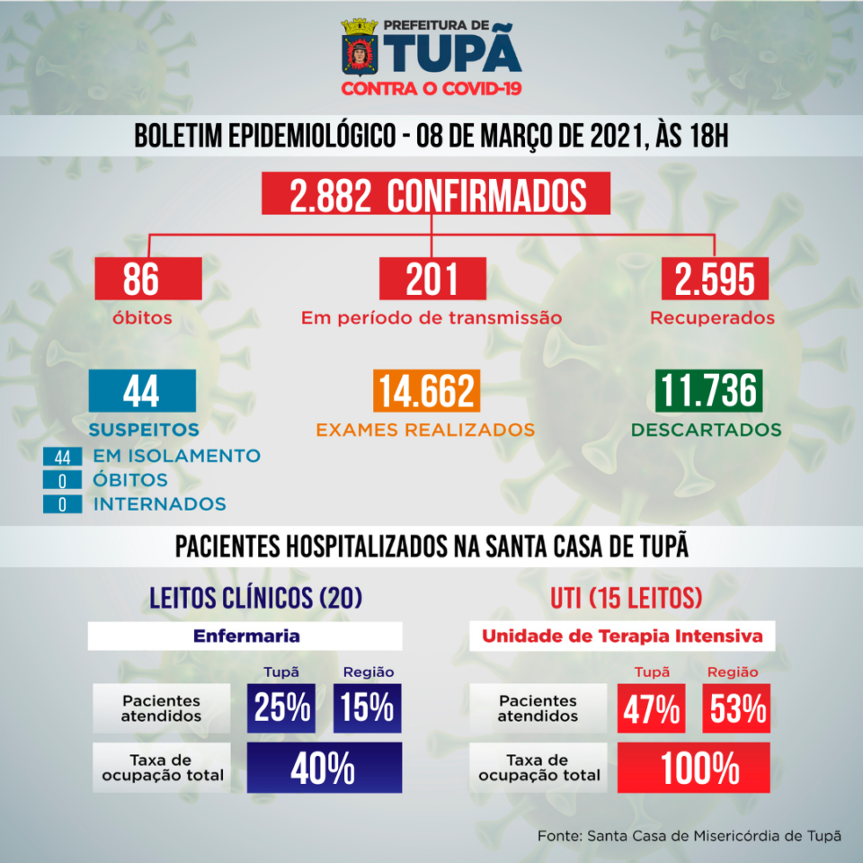 Tupã tem 2.882 casos confirmados, sendo 2.595 curados e 86 mortes.