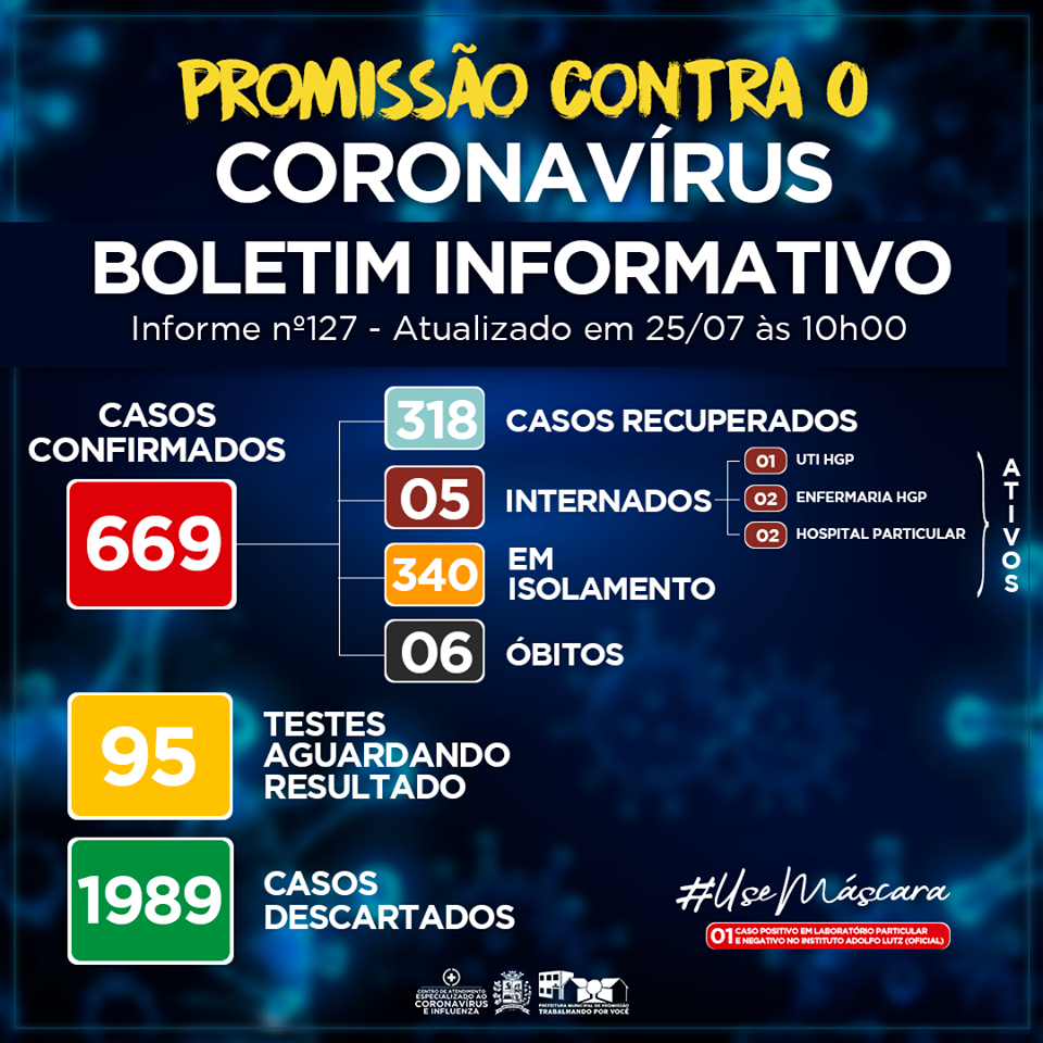 A cidade contabiliza 669 testes positivos da doença, sendo 318 considerados recuperados e seis óbitos. Outros 95 casos suspeitos estão em investigação.