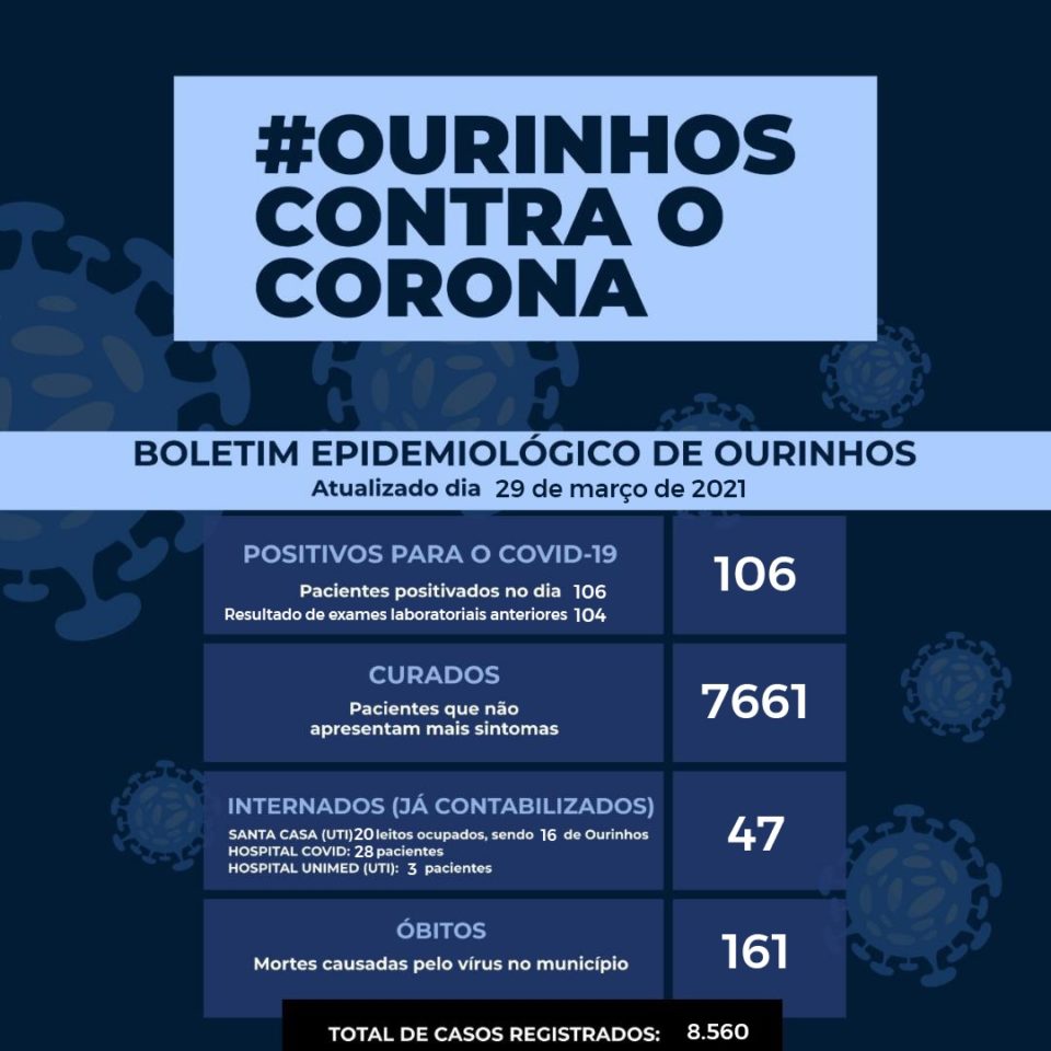 Ourinhos contabiliza 8.560 casos positivos, sendo 7.661 curados e 161 óbitos.