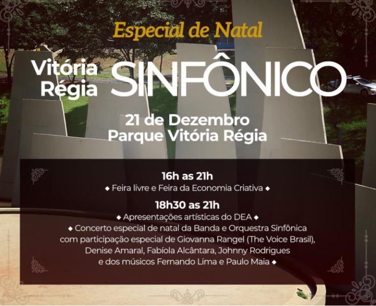 A Feira Especial de Natal contará com a participação dos feirantes da Feira Livre, que acontece no Parque, das barracas de artesanato da Feira de Economia Criativa, apresentações culturais dos alunos do Departamento de Ensino as Artes (DEA) e concerto especial de natal “Vitória Régia Sinfônico” da Banda e da Orquestra com os convidados especiais que apresentarão músicas com temas natalinos, MPB e Jazz.