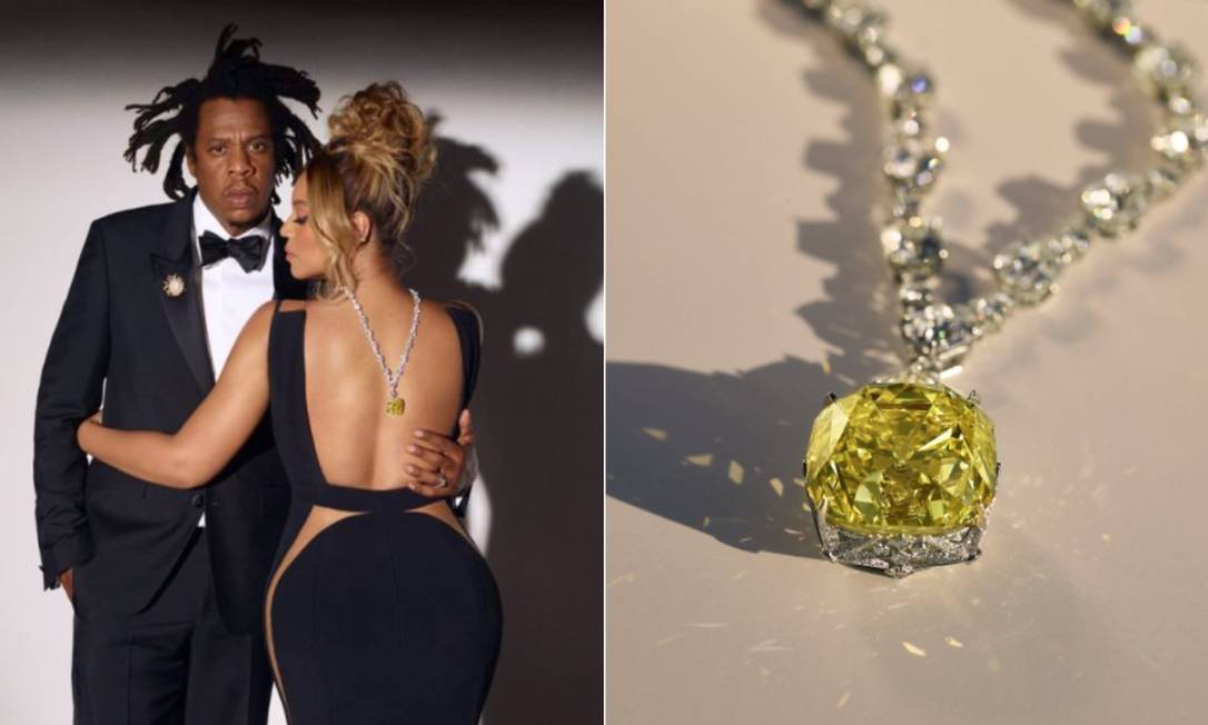 O casal também posou diante de uma releitura de um quadro de Jean-Michel Basquiat. O conhecido matiz azul esverdeado de Tiffany foi o escolhido para a ocasião. Mas o que chama atenção é o diamante amarelo, o mais famoso do mundo, que foi ostentado por Beyoncé. A peça custa US$ 30 milhões ou, no valor atual, mais de R$ 160 milhões, e raramente é vista em público.