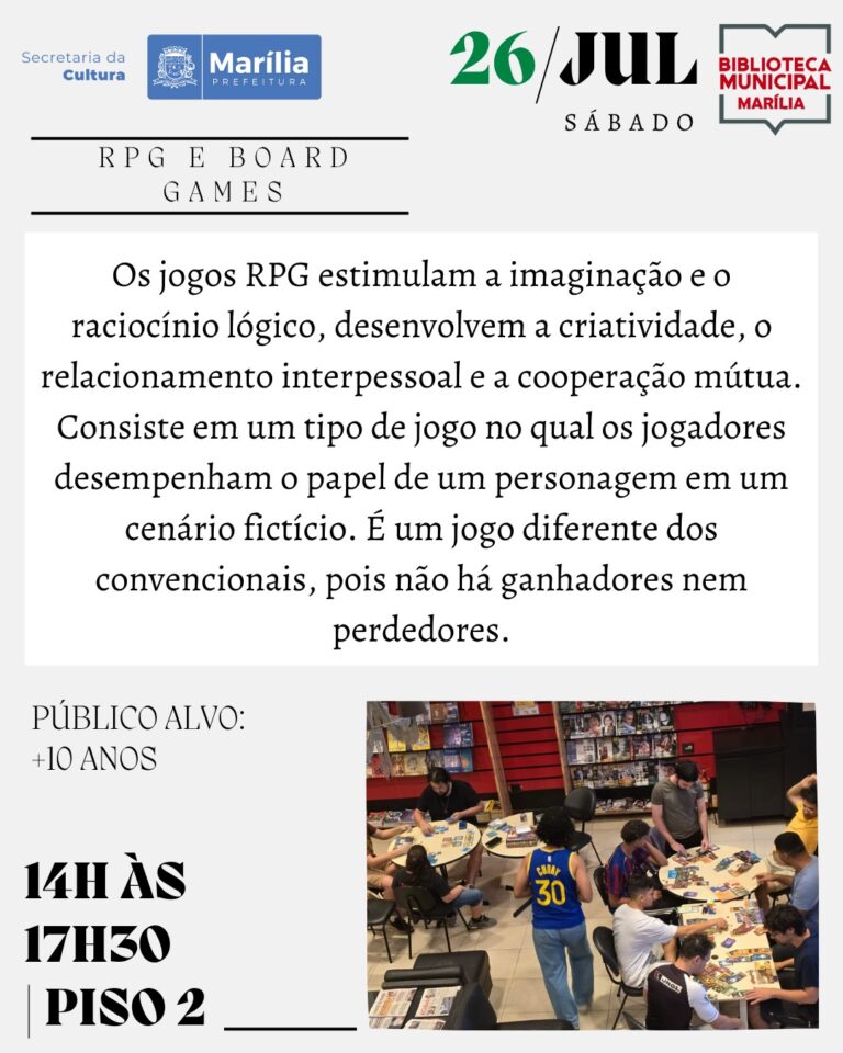 - oficina de RPG e board games (Projeto Legião), das 14h às 17h30, no piso 2, para maiores de 10 anos;