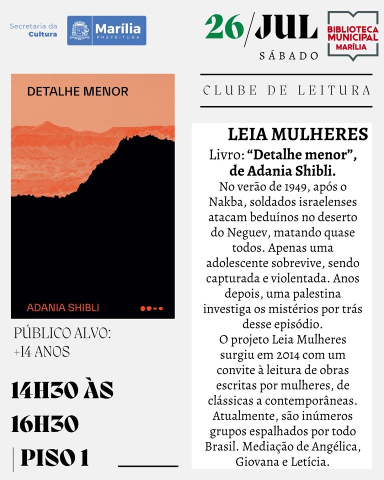 - clube de leitura “Leia Mulheres”, das 14h30 às 16h, no piso 1, para maiores de 14 anos, com debate sobre o livro “Detalhe menor”, de Adania Shibli, mediado por Giovana e Letícia;