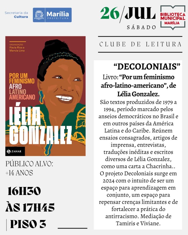 - clube de leitura “Decoloniais”, das 16h30 às 17h45, no piso 3, também para maiores de 14 anos, com leitura e discussão da obra “Por um feminismo afro-latino-americano”, de Lélia Gonzalez, com mediação de Tamiris e Viviane.