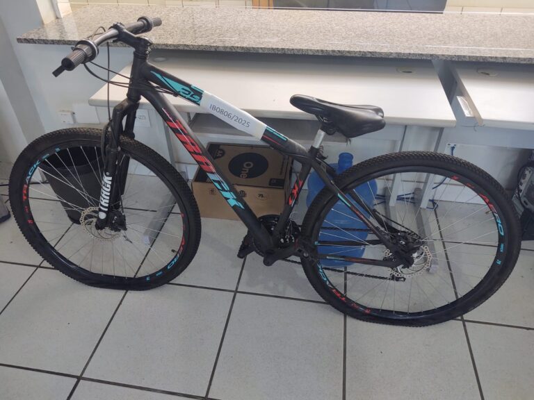 A equipe policial esteve no local e constatou o abandono. A bicicleta, uma Track TK3, aro 29, de cor preta com detalhes em azul e vermelho, foi recolhida para apuração da procedência e possível identificação do proprietário para restituição. Ela conta com número de série registrado no quadro, o que pode ajudar a comprovar sua origem.
