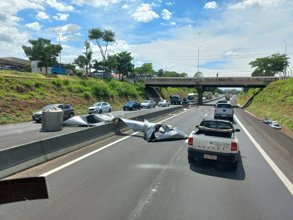 O objeto ainda causou danos na mureta de separação dos sentidos da rodovia. A bobina está caída entre as duas vias da SP-294 e, por isso, a pista em ambos os sentidos segue parcialmente interditada. Os motoristas que trafegam pela região devem redobrar a atenção, já que o tráfego está lento.
