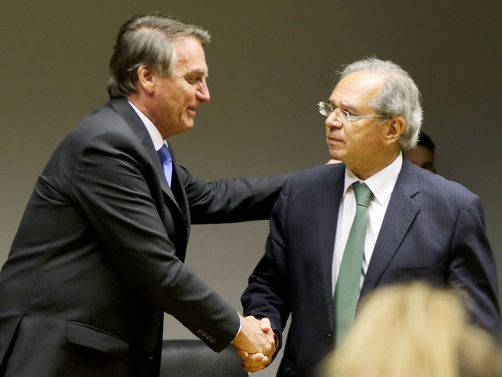 O presidente da República, Jair Bolsonaro e o ministro da economia, Paulo Guedes,fazem declaração conjunta à imprensa no auditório do ministério da economia em Brasília
