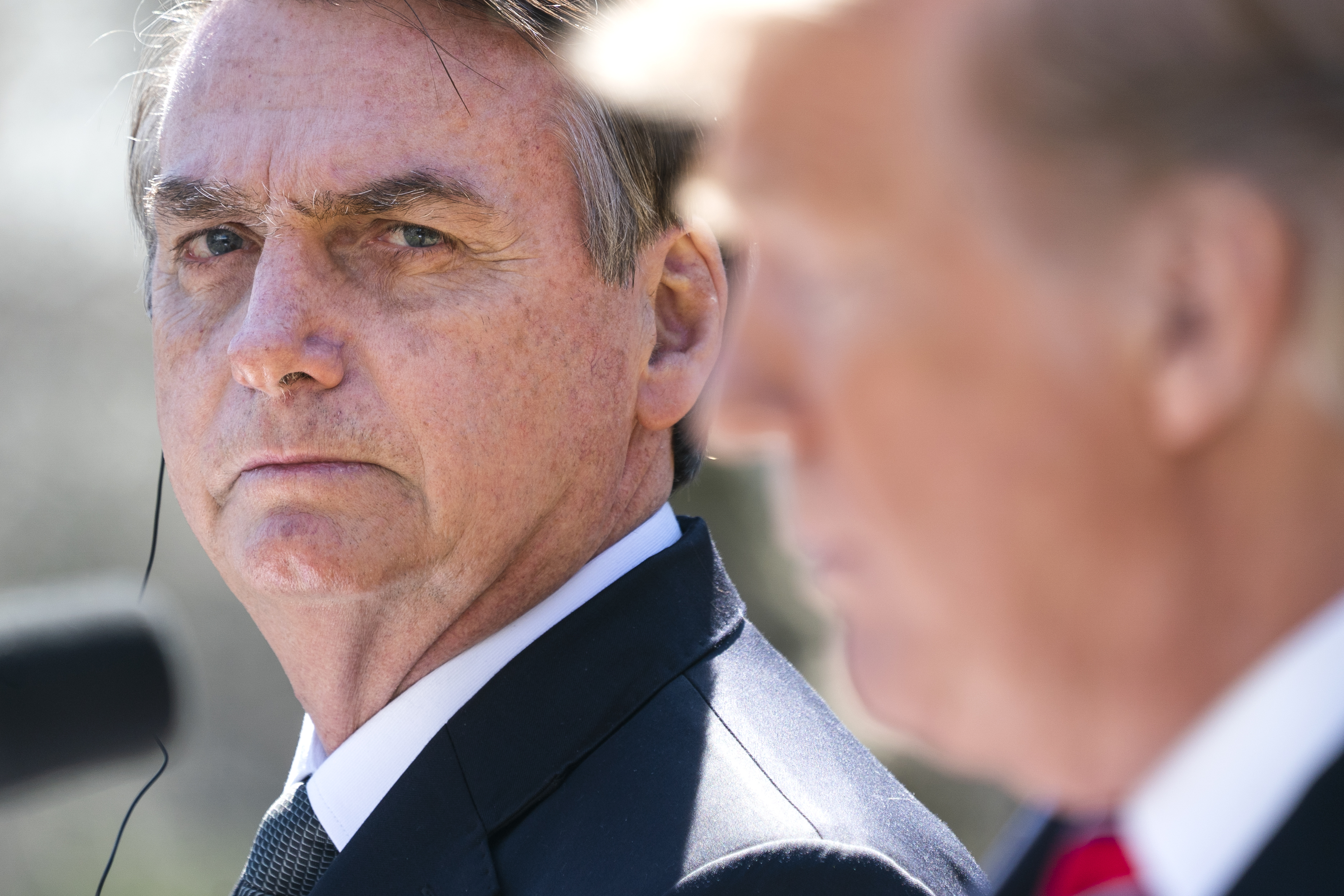 WASHINGTON, DC - MARCH 19: (AFP OUT) Brazilian President Jair Bolsonaro listens to U.S. President Donald Trump at a joint news conference in the Rose Garden at the White House March 19, 2019 in Washington, DC. President Trump is hosting President Bolsonaro for a visit and bilateral talks at the White House today. (Photo by Jim Lo Scalzo-Pool/Getty Images)