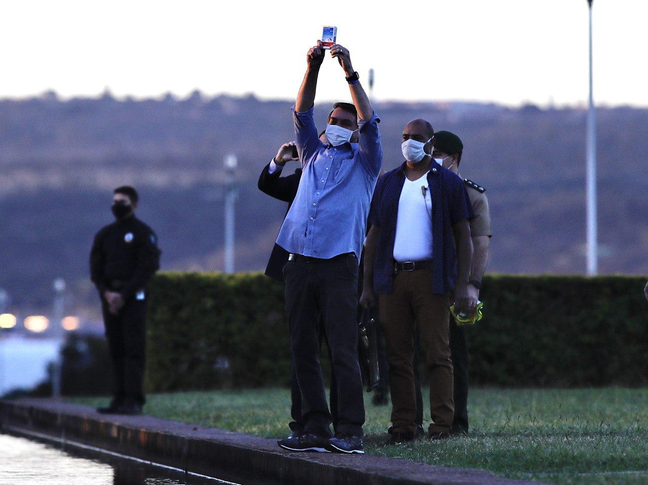 O presidente está com covid-19 e permanece em sua residência oficial em Brasília. Ele caminhou até o espelho d’água para conversar com apoiadores que se aglomeraram do lado de fora do Palácio. Muitos deles sem máscaras.