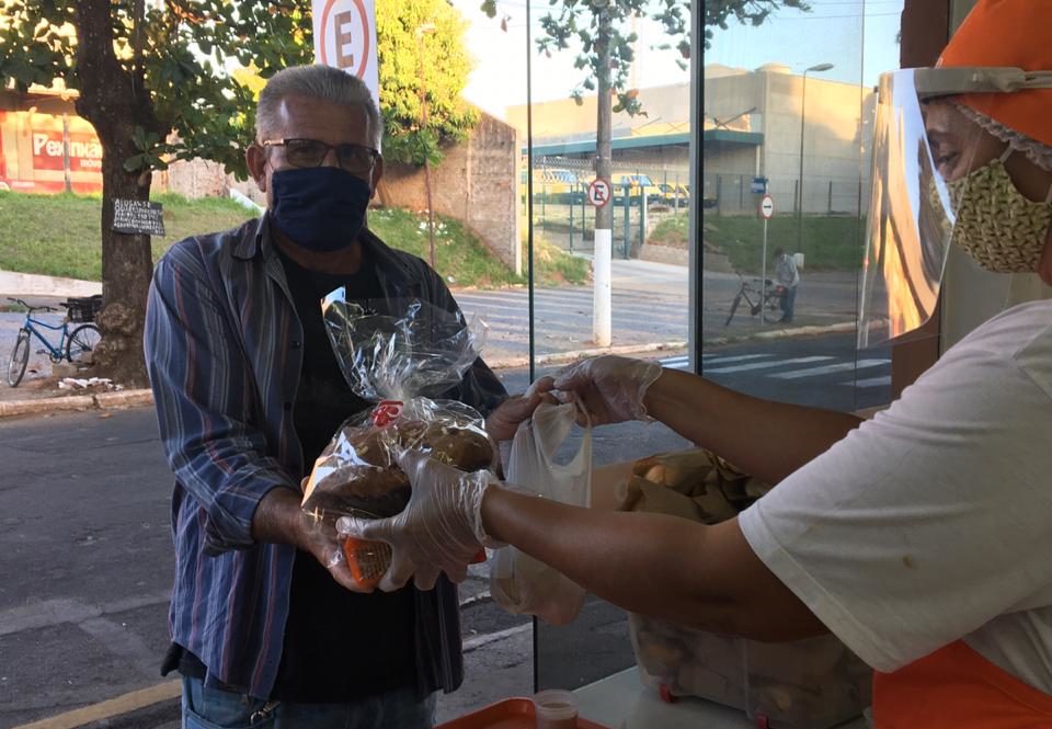 Para evitar aglomeração de pessoas, as refeições são fornecidas em embalagens para que as pessoas possam pegar e comer em outro lugar.