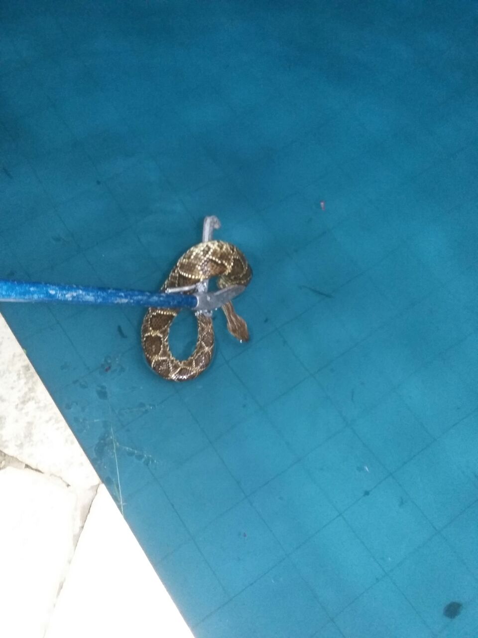 Por volta das 17h uma cascavel foi encontrada no condomínio de chácaras Santa Gertrudes. Um dos moradores, assustado, teria jogado a cobra com uma vassoura dentro da piscina.