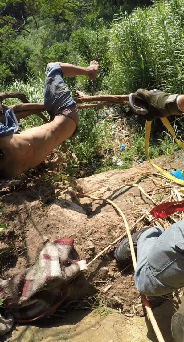 Ao chegar no local, os bombeiros encontraram a vítima estava enroscada em meio a vegetação, a uma altura aproximada de 10 metros.