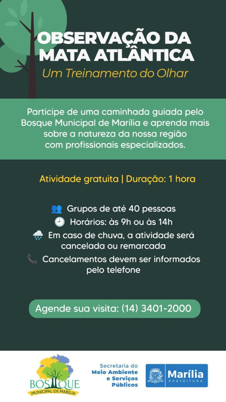 O Bosque Municipal de Marília retomou o agendamento para visitas monitoradas e atividades de educação ambiental. A iniciativa, promovida pela Secretaria Municipal do Meio Ambiente e Serviços Públicos, é voltada a escolas, instituições e demais grupos interessados em conhecer o espaço e aprender sobre preservação ambiental de forma prática.