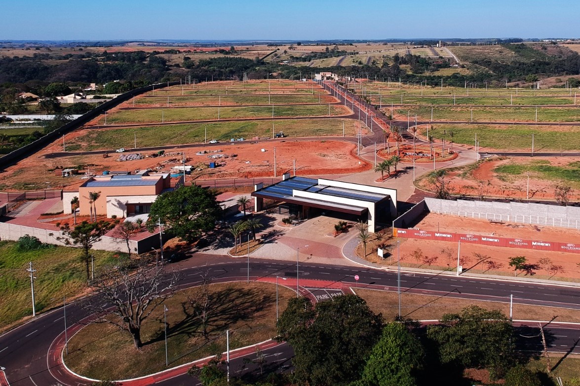 Vista aérea do Residencial Boulevard Park Resort, com salão de festas ao lado da entrada e clube social ao fundo, voltado para o vale (Foto: Divulgação)