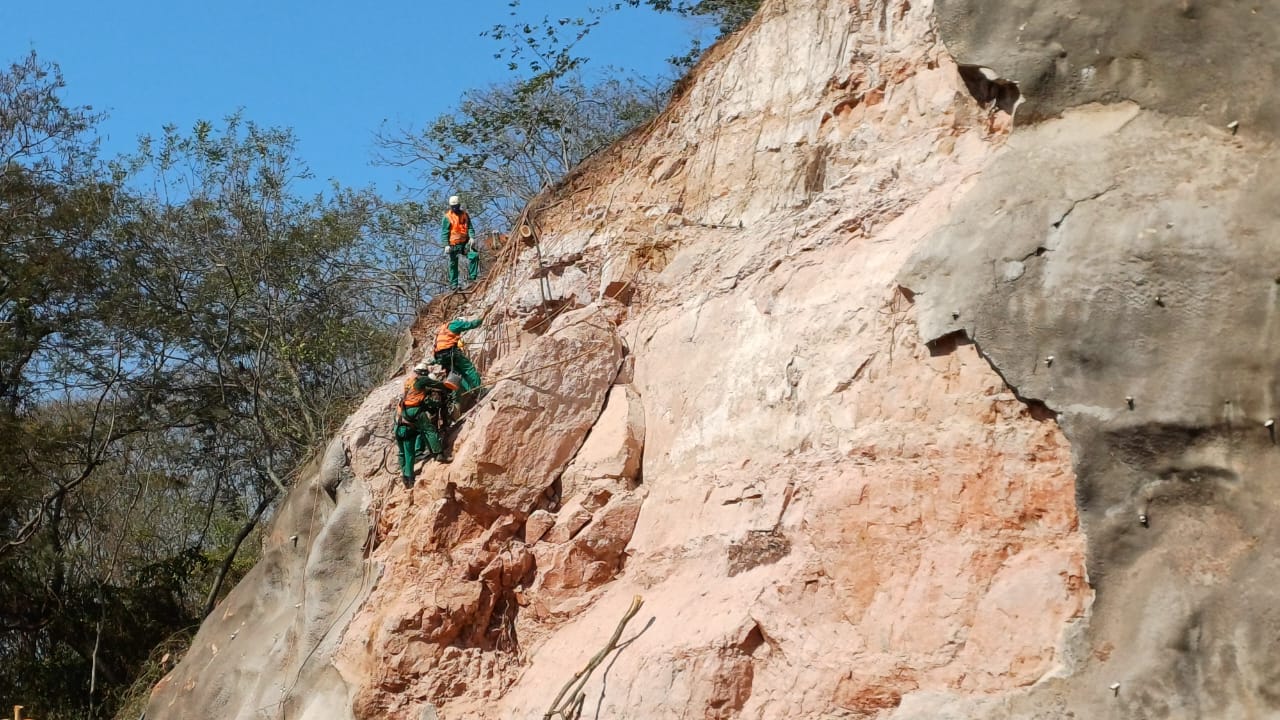As equipes contratadas utilizam técnicas de rapel e britadeiras para remover as rochas ainda soltas, eliminando o risco de novos deslizamentos.