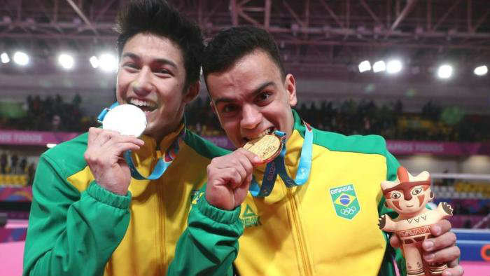O Brasil voltou a brilhar na ginástica artística nos Jogos Pan-Americanos de Lima, no Peru, nesta segunda-feira. O time nacional faturou uma inédita dobradinha no individual geral masculino, com Caio Souza e Arthur Nory, medalhistas de ouro e prata, respectivamente.