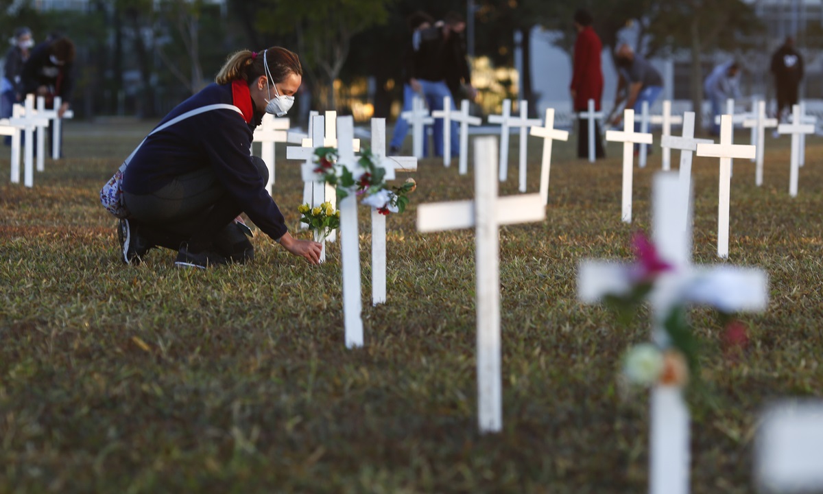 A demonstrator places flowers next to a cross during a protest against Brazilian President Jair Bolsonaro and in honour of the people who died of COVID-19 in which 1000 crosses were placed in front of the National Congress in Brasilia, on June 28, 2020, amid the novel coronavirus pandemic. - The pandemic has killed at least 495,288 people worldwide, including more than 55,000 in Brazil, since it surfaced in China late last year, according to an AFP tally at 1900 GMT on Saturday, based on official sources. (Photo by Sergio LIMA / AFP)