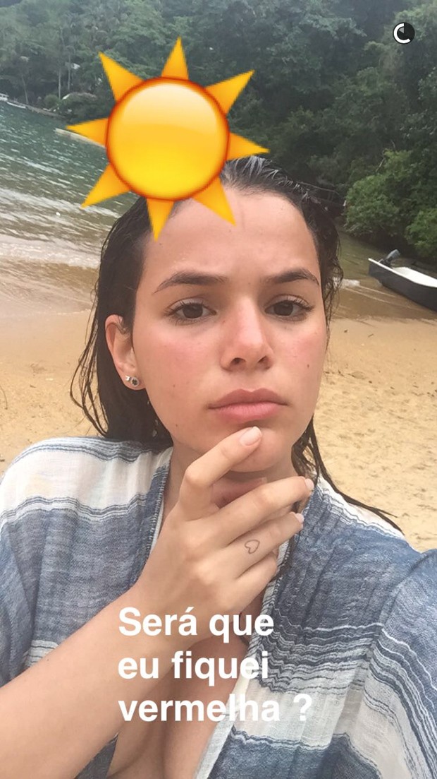 Bruna Marquezine mostrou resultado de bronzeado em fotos no Snapchat. “Será que fiquei vermelha”, comentou ela ao mostrar o rosto vermelhinho após sol.