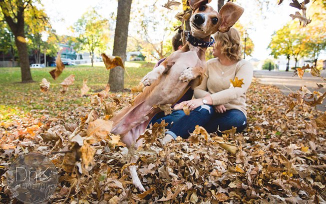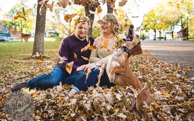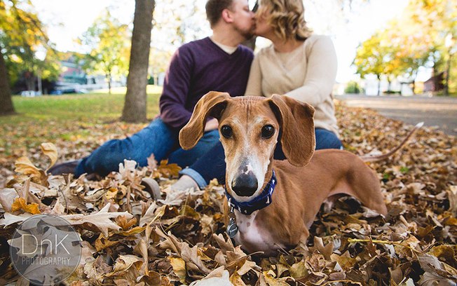Esse casal de Minnesota, EUA, os jovens Megan Determan e Chris Kluthe resolveram incluir o seu cachorro “salsica” Louie. E ele acabou se tornando a grande estrela do ensaio fotográfico com seu jeito engraçado, irreverente e, sim, muito fofinho.