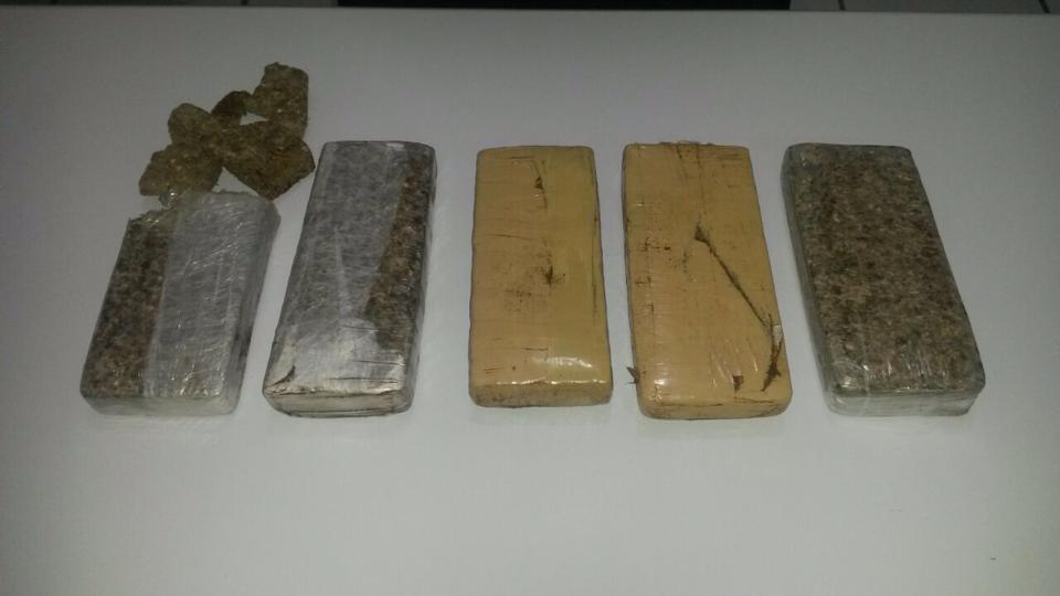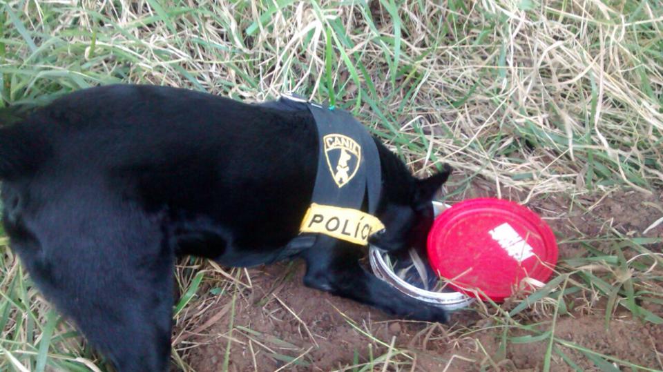 Os cães farejadores ‘Fará’ e ‘Pretinha’, fizeram uma varredura no local e acabaram encontrando 5 tijolos de maconha espalhados pelo terreno. Dois dos tabletes estavam em uma mochila escolar e os outros 3 dentro de sacos de pó de café, acondicionados dentro de um balde enterrado.