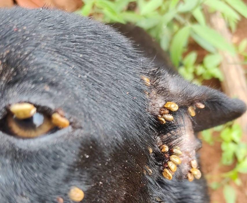 Nos fundos da casa, os policias encontraram dois cães de pequeno porte sem raças definidas. O cachorro de cor preta estava infestado de carrapatos, preso com uma corrente curta, sem alimento, sem água e sem abrigo.
