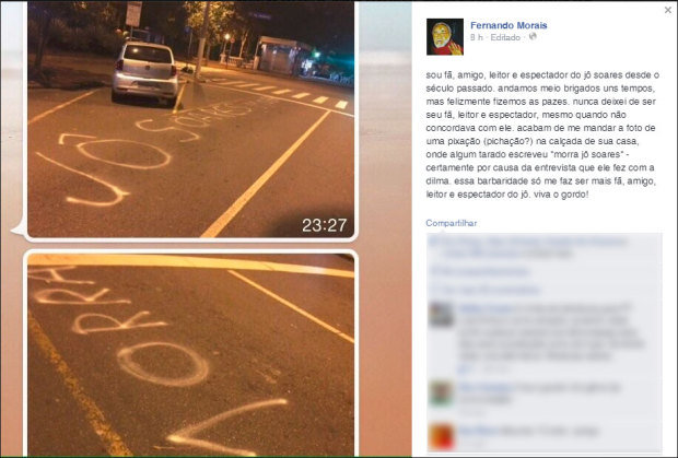 Fernando Morais ainda escreveu a seguinte mensagem: “Sou fã, amigo, leitor e espectador do Jô Soares desde o século passado. Andamos meio brigados uns tempos, mas felizmente fizemos as pazes. Nunca deixei de ser seu fã, leitor e espectador, mesmo quando não concordava com ele. Acabam de me mandar à foto de uma pixação (pichação?) na calçada de sua casa, onde algum tarado escreveu “Morra Jô Soares” – certamente por causa da entrevista que ele fez com a Dilma. Essa barbaridade só me faz ser mais fã, amigo, leitor e espectador do Jô. Viva o Gordo!”