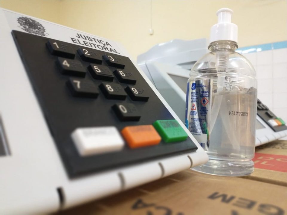 Urnas eletrônica, ao lado de frasco de álcool em gel (Foto: Marília Notícia)