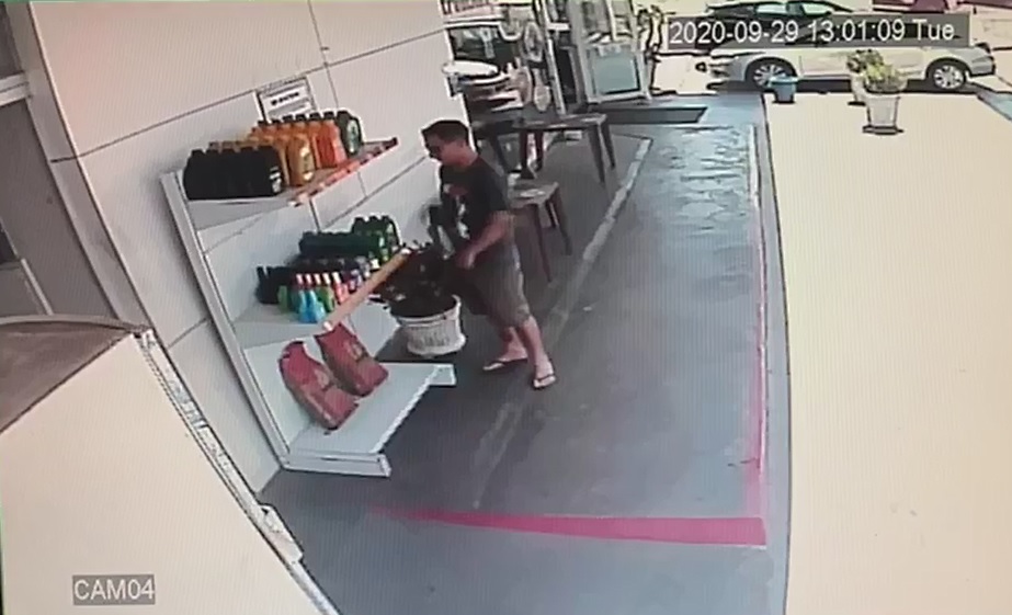 As câmeras de segurança do estabelecimento flagraram a ação do criminoso. O indivíduo chega perto do local onde ficam os óleos lubrificantes, finge estar olhando os produtos , coloca um frasco embaixo da blusa e sai como se nada tivesse acontecido.