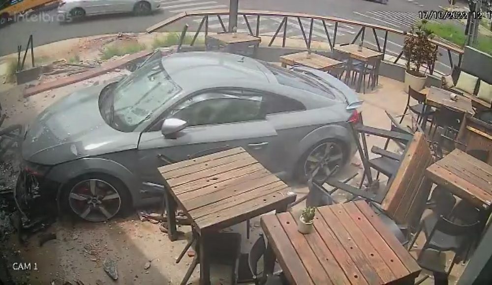 Parte da área externa da doceria é destruída com o impacto. Felizmente, não havia ninguém nas mesas externas na hora do acidente. O extintor chegou a ser usado no automóvel para prevenir um incêndio.