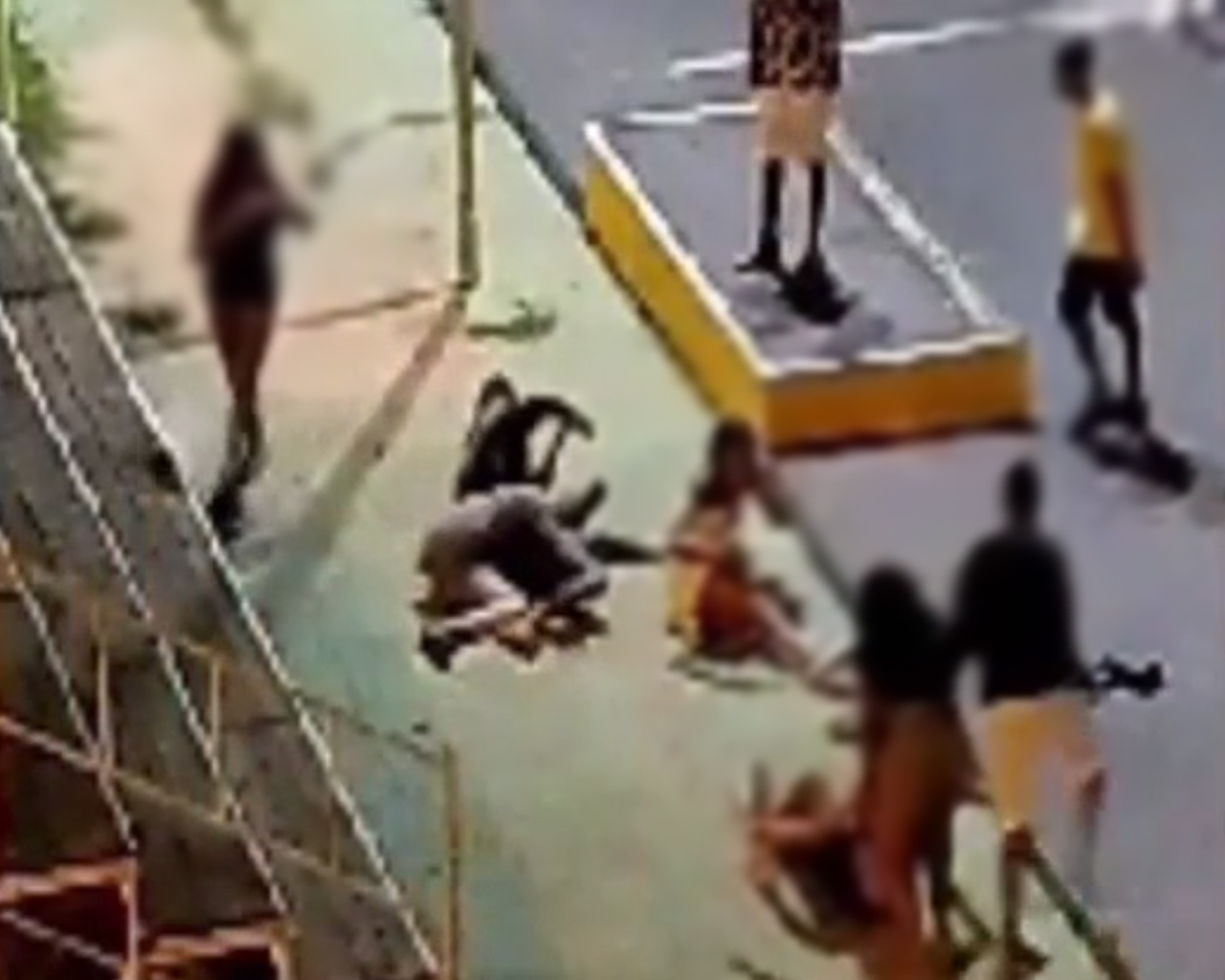 Pelo vídeo é possível ver os dois adolescentes caídos no chão, com a vítima por baixo. Um adolescente chega a dar alguns ‘pisões’, aparentemente na vítima, que foi esfaqueada e tenta se defender.
