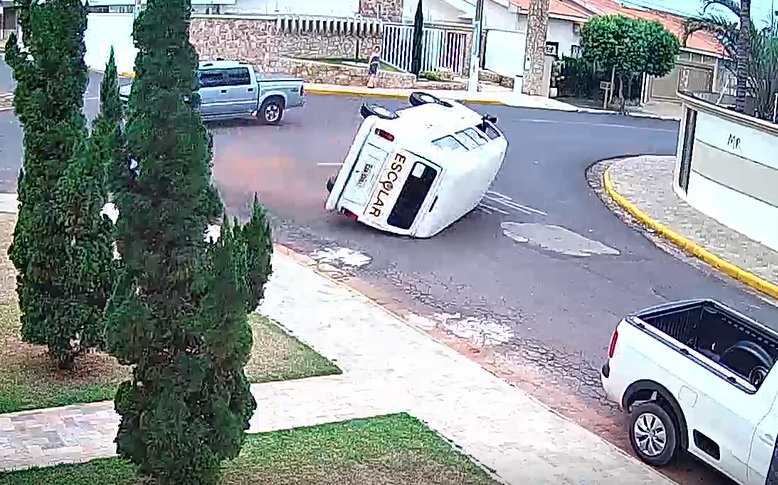 Imagens de câmeras de segurança de uma casa registraram a batida, e mostram que o motorista da Van não respeitou a sinalização de “pare”. Em seguida, ele tem o veículo atingido por uma caminhonete e tomba.
