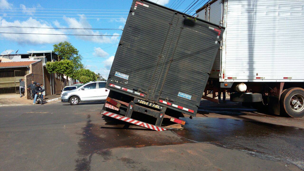 Segundo testemunhas, as rodas ficaram presas no buraco e um guincho ajudou a retirar o caminhão do local. Um outro caminhão foi inclusive usado para ‘apoiar’ o veículo que estava quase tombando.