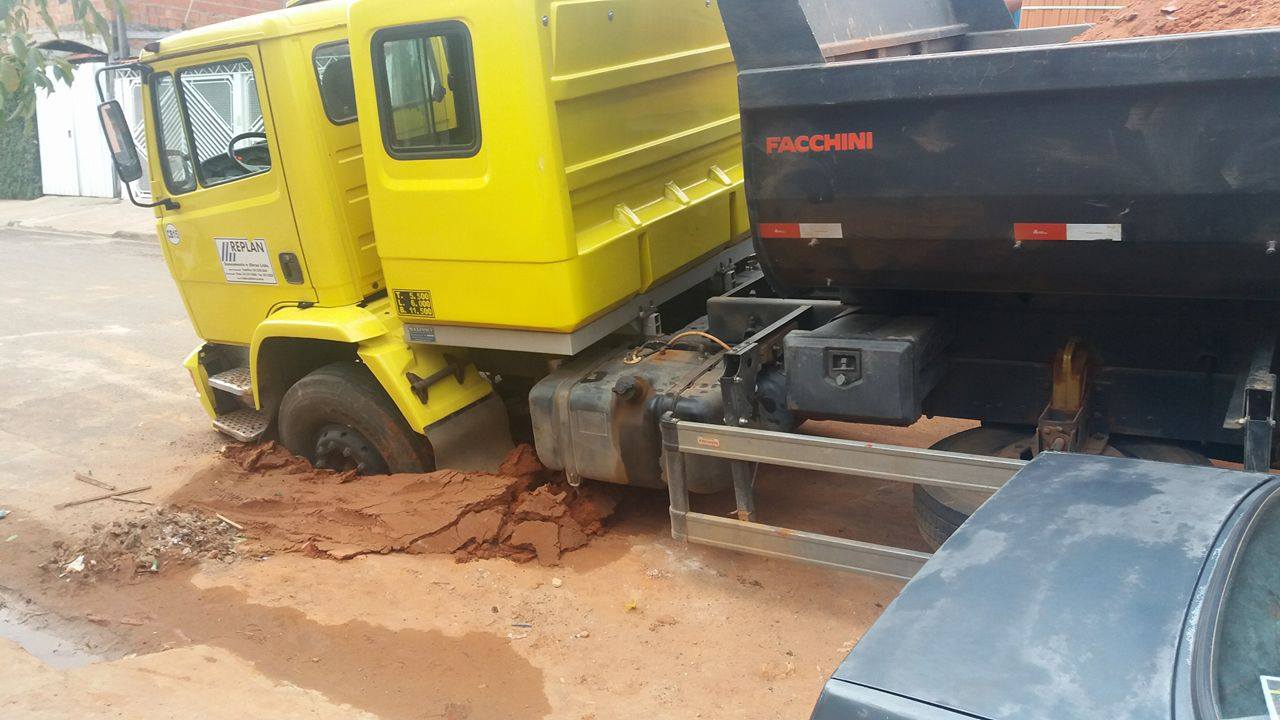 O caso aconteceu na tarde de ontem (7) e foi flagrado pela leitora Arianne Priscila. Segundo testemunhas, as rodas ficaram presas no buraco e um guincho ajudou a retirar o caminhão do local.