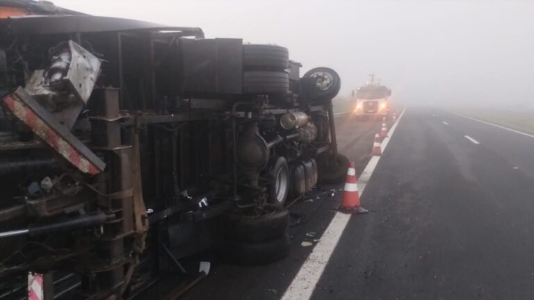 Durante a madrugada, a concessionária informou que os veículos foram reposicionados no acostamento. O automóvel seria removido até a base da Polícia Militar Rodoviária, enquanto o destombamento do caminhão foi adiado para a manhã devido à neblina.