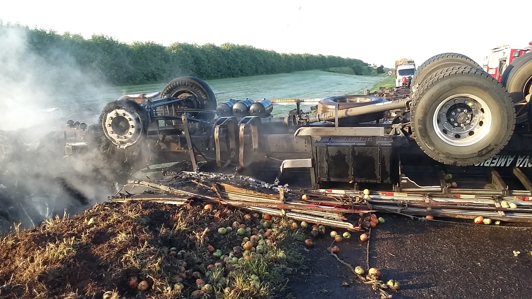 De acordo com informações da Polícia Rodoviária Federal, o caminhão carregado com tomates, seguia de Goiânia para Curitiba quando caiu em uma ribanceira e capotou.