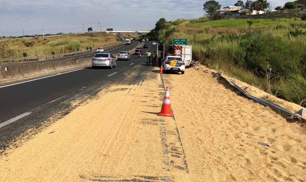 Um caminhão carregado com arroz tombou na manhã desta terça-feira (18) na Rodovia Comandante João Ribeiro de Barros em Marília.