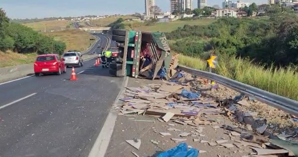 O motorista perdeu o controle da direção e acabou tombando o caminhão no quilômetro 447, no sentido do Hospital das Clínicas (HC) à Unimar.
