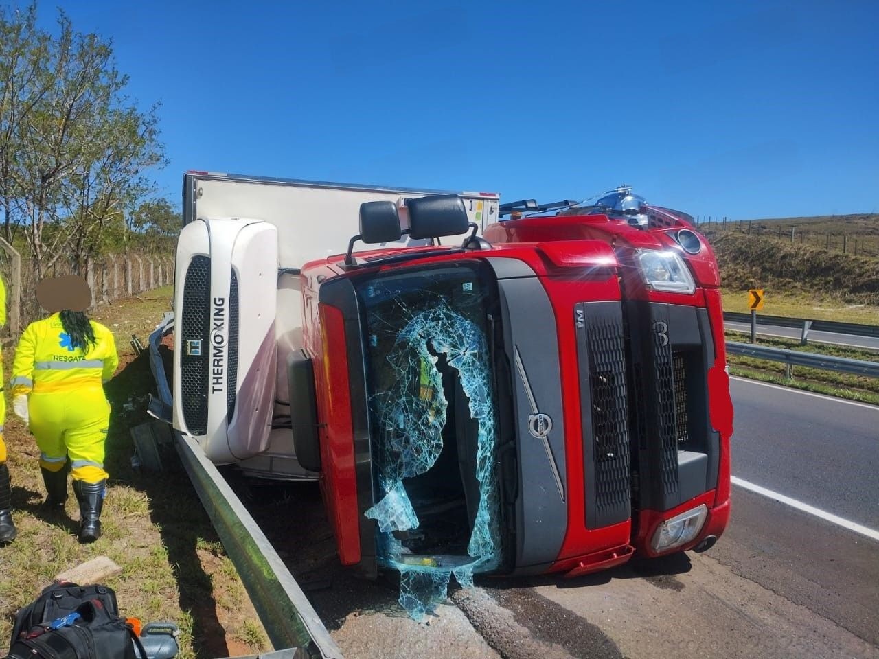 O caminhão acabou tombando pelo acostamento, na altura do km 392. O motorista sofreu ferimentos leves e o passageiro que estava na boleia saiu ileso.