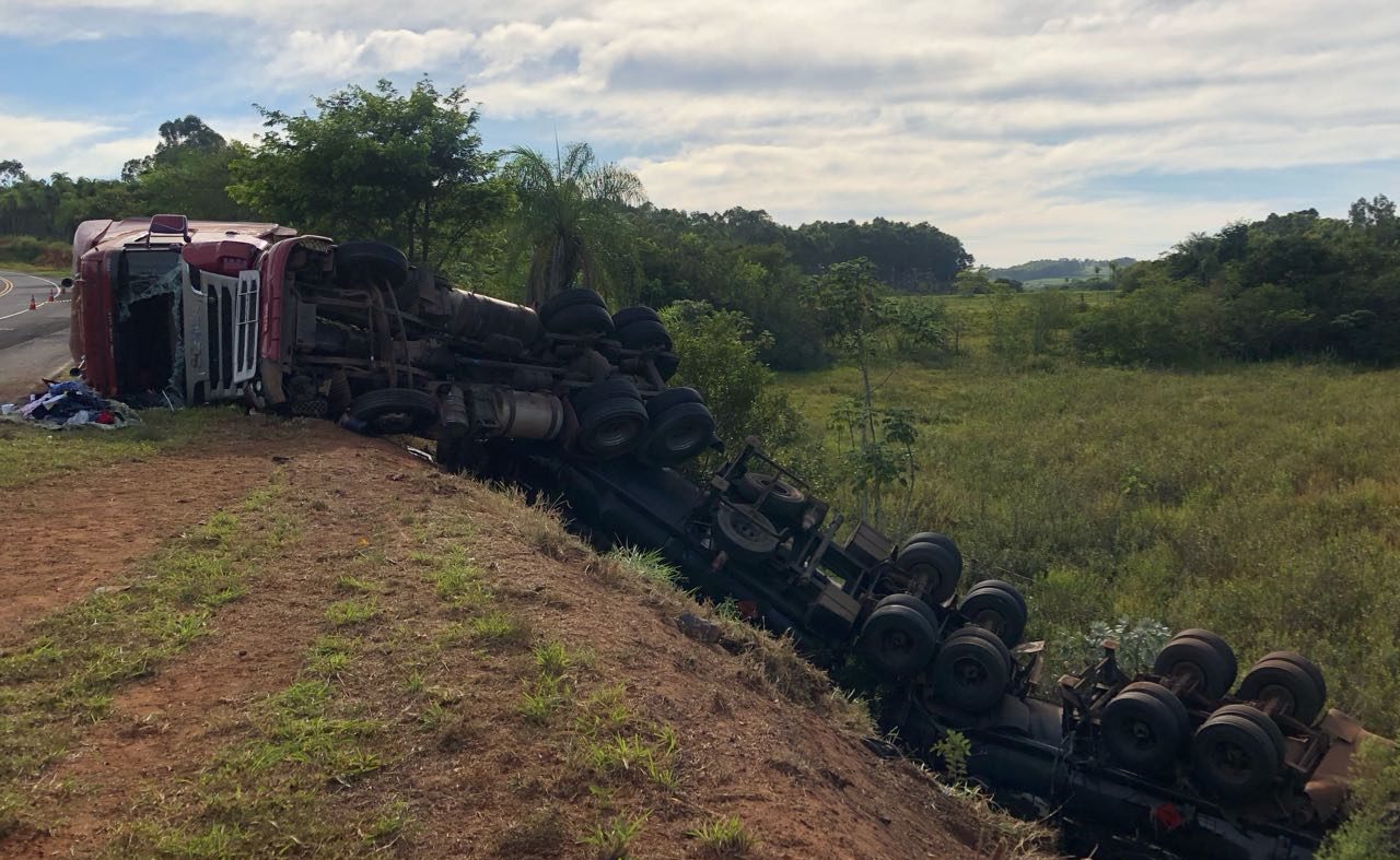 Caminhão bitrem com 45 mil litros de etanol tombou na manhã desta quarta-feira (18), no quilômetro 311 da rodovia SP-333, em Marília. O local fica a aproximadamente um quilômetro de distância do rio Tibiriçá.
