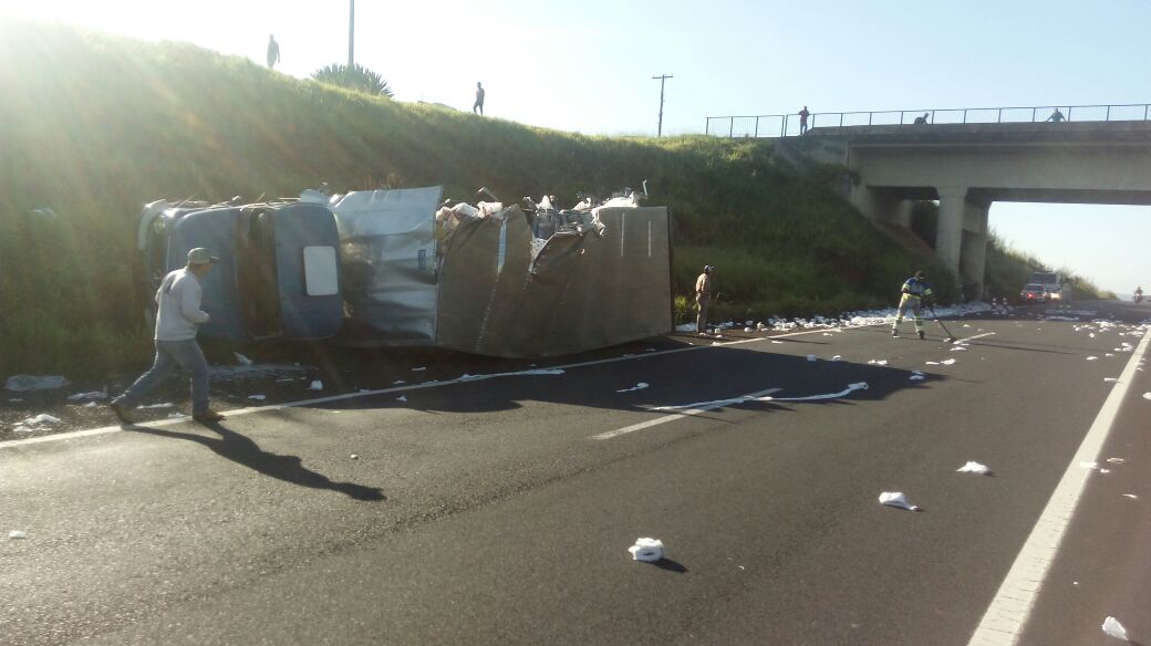 Um caminhão carregado com papel higiênico tombou na rodovia SP-294, entre Vera Cruz e Marília, durante a manhã desta segunda-feira (8). Apesar dos danos no veículo, ninguém ficou ferido.